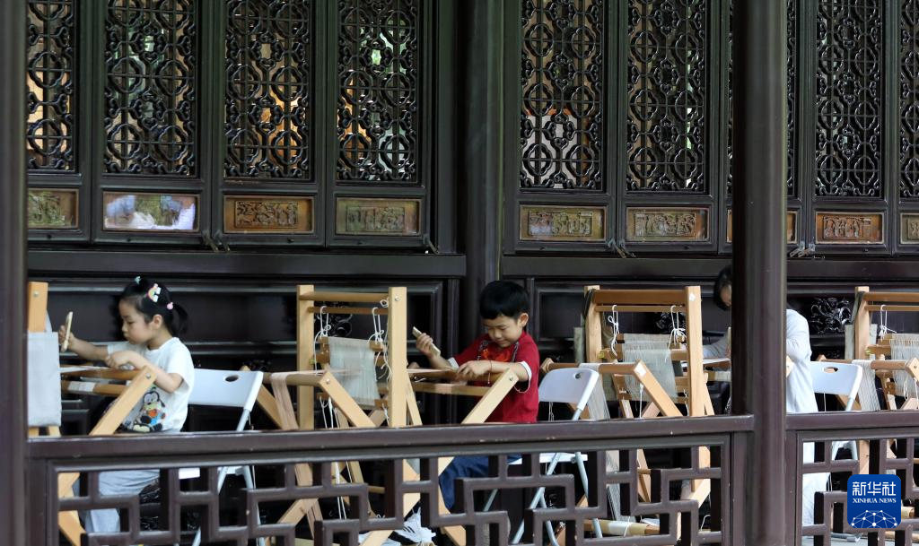 6月11日,在江苏苏州拙政园,小朋友在体验缂丝非遗技艺。新华社发(杭兴微摄)