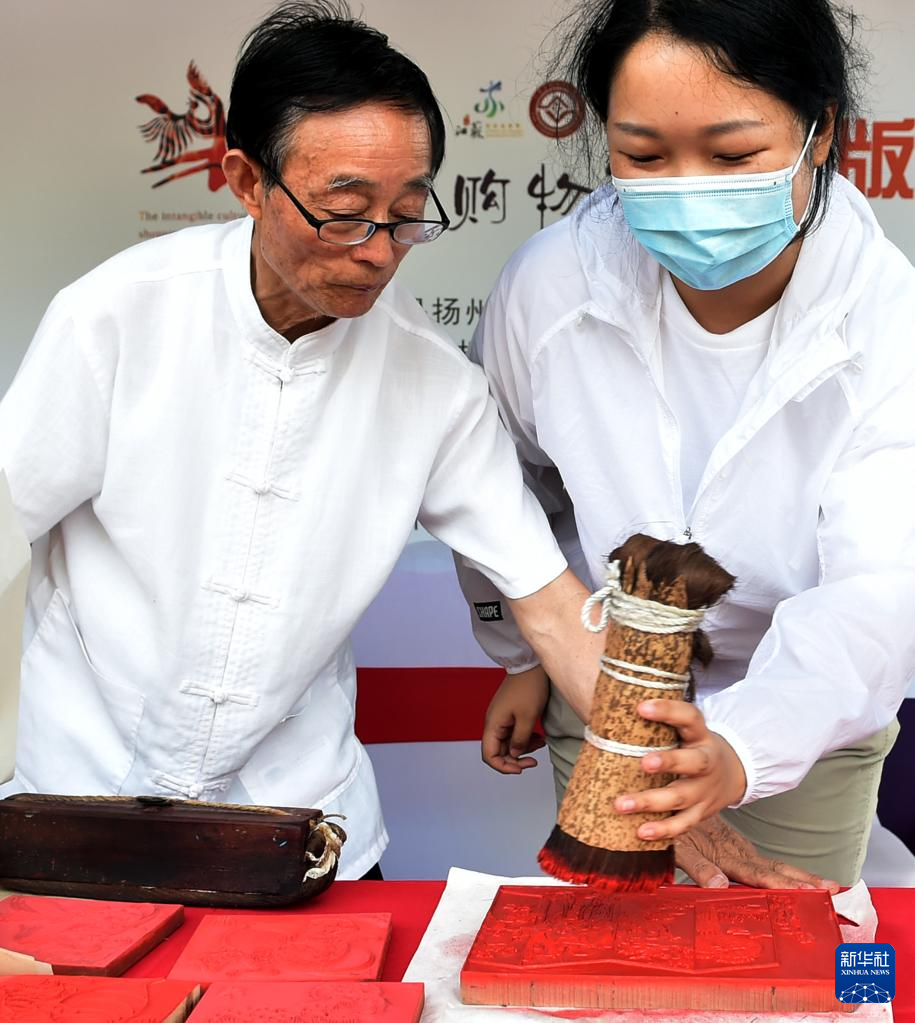 6月10日,在江苏省镇江市举行的非遗项目“雕版印刷技艺”展示现场,代表性传承人李江民(左一)指导游客体验“雕版印刷技艺”的传统手工刷墨环节。新华社发(庄文斌摄)