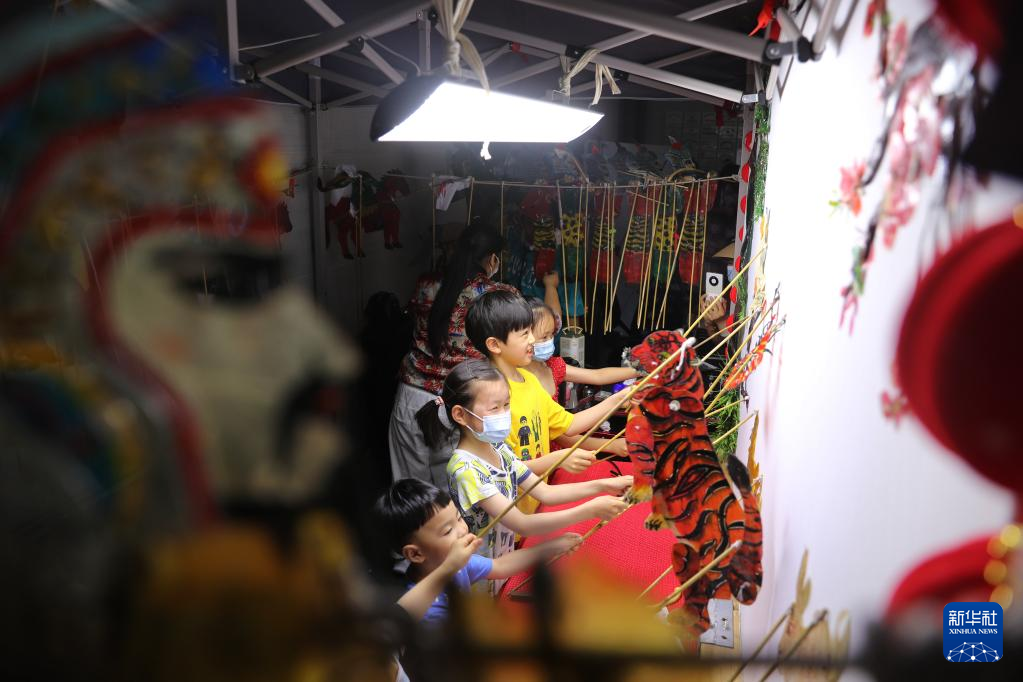 6月11日,在安徽博物院,小朋友在体验皮影戏。新华社发(许昊摄)