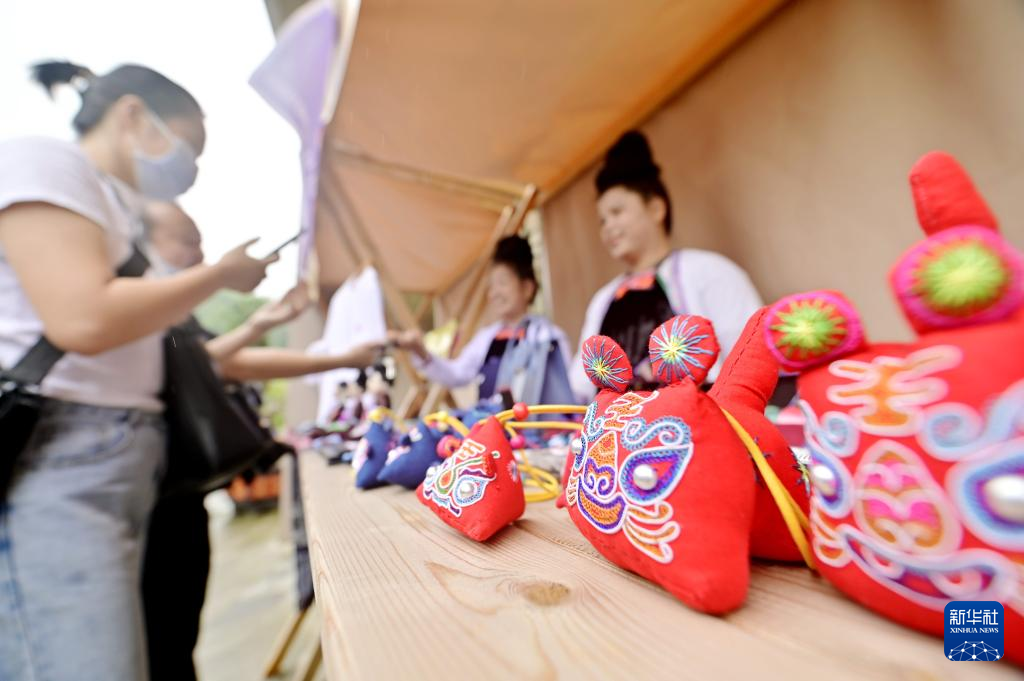 6月11日,在贵州省从江县丙梅街道,市民在非遗集市上选购刺绣产品。新华社发(吴德军摄)