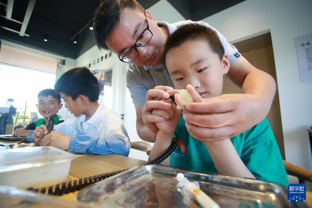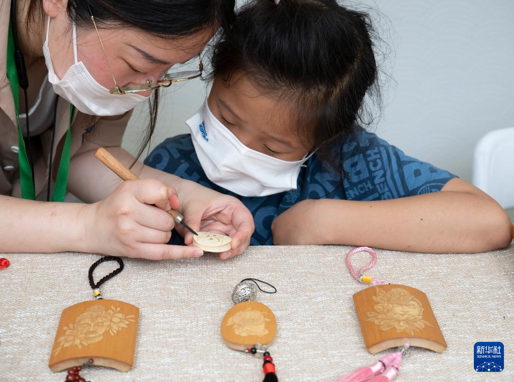 6月11日,在江苏省扬州市杉湾花园社区,一名非遗传承人指导小朋友制作玉雕作品。新华社发(孟德龙摄)