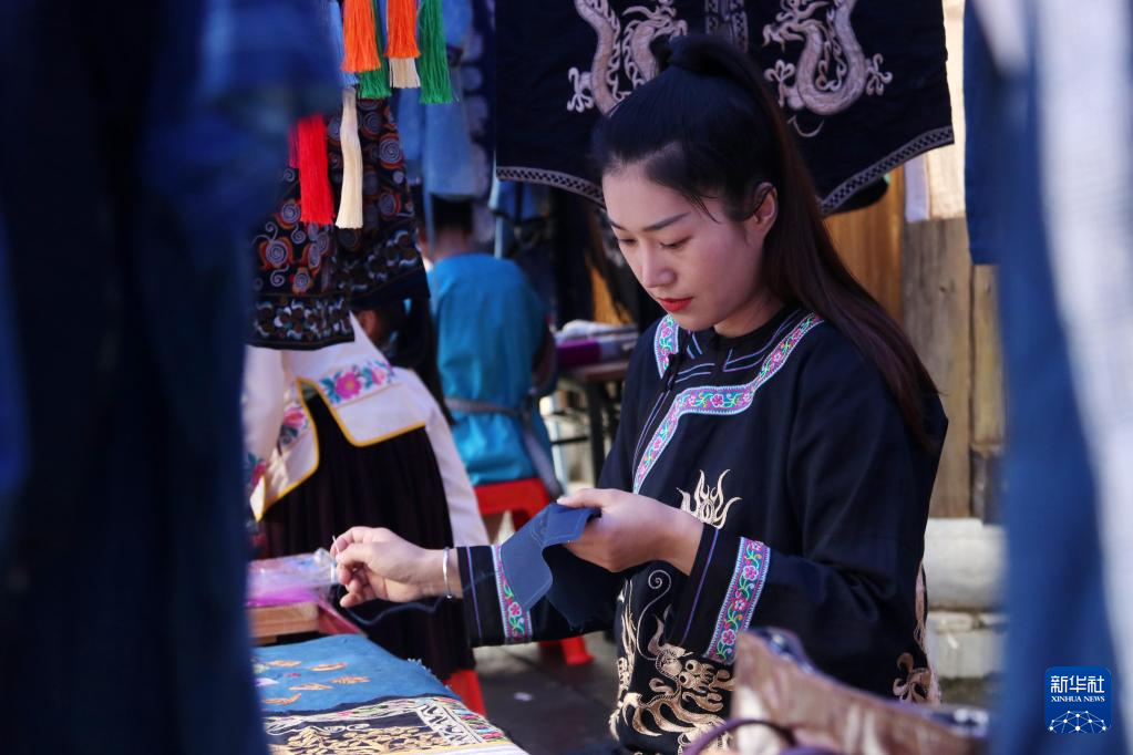 6月11日,绣娘在贵州省黔东南苗族侗族自治州黎平县非遗特色文创产品展销活动上制作绣品。新华社发(杨代富摄)
