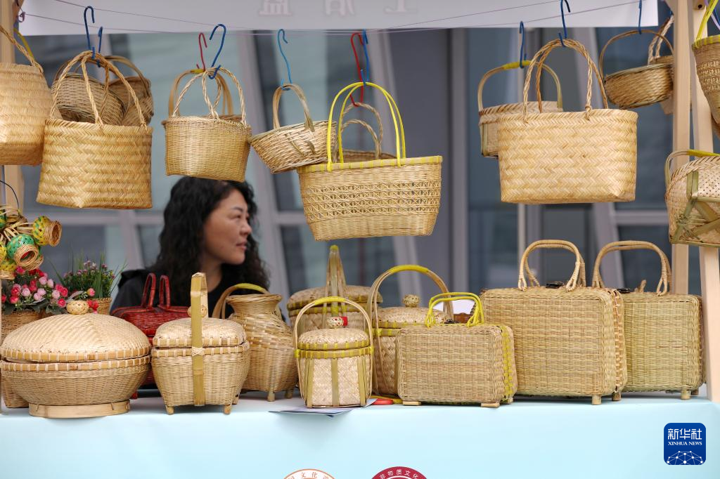 6月11日,在浙江省嘉兴市文化艺术中心非遗市集上,手艺人展示竹编产品。新华社发(金鹏摄)