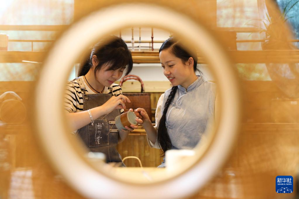 6月11日,在贵州省赤水市大同镇竹编非遗产学研基地,一名学员(左)学习竹编技艺。新华社发(杨洋摄)