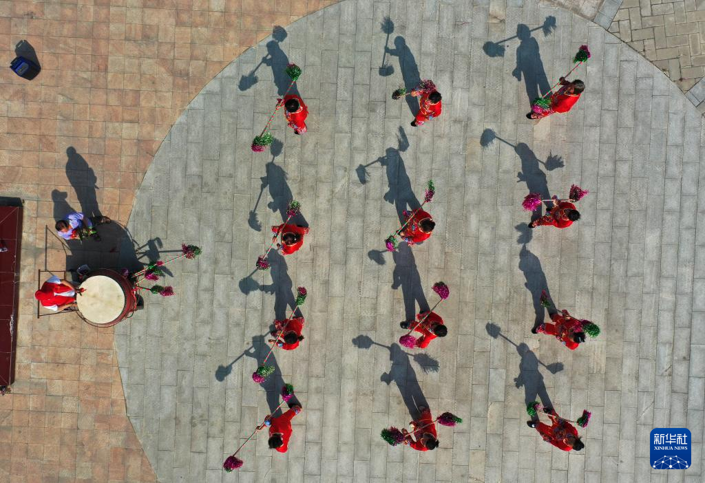 6月11日,艺人在河南省平顶山市宝丰县张八桥镇文化活动广场表演非遗项目花棍舞(无人机照片)。新华社发(何五昌摄)