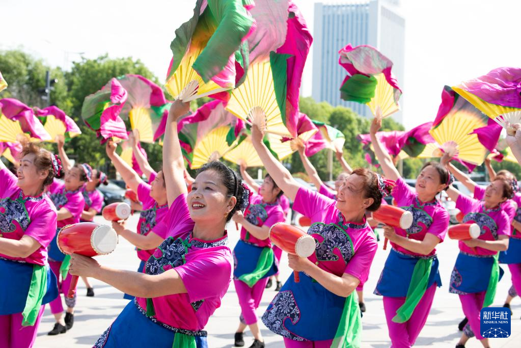 6月11日,在江苏省海安市文化艺术中心广场,演员表演非遗项目海安花鼓。新华社发(徐劲柏摄)