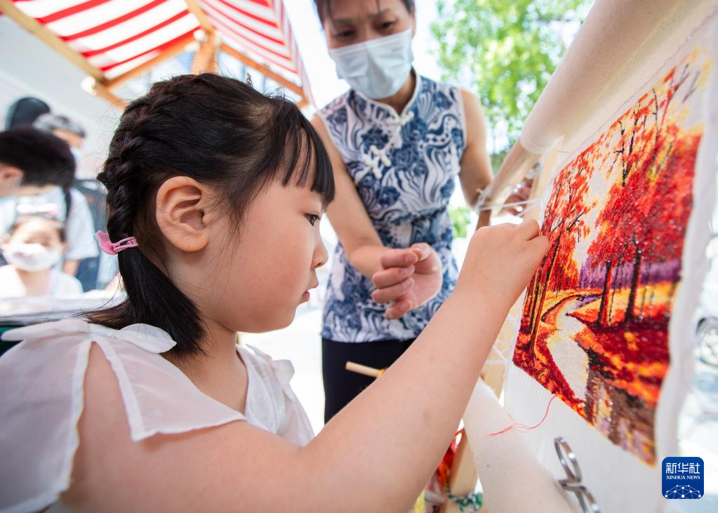 6月11日,在南京市非遗体验中心,一名小朋友体验南京刺绣技艺。新华社发(苏阳摄)
