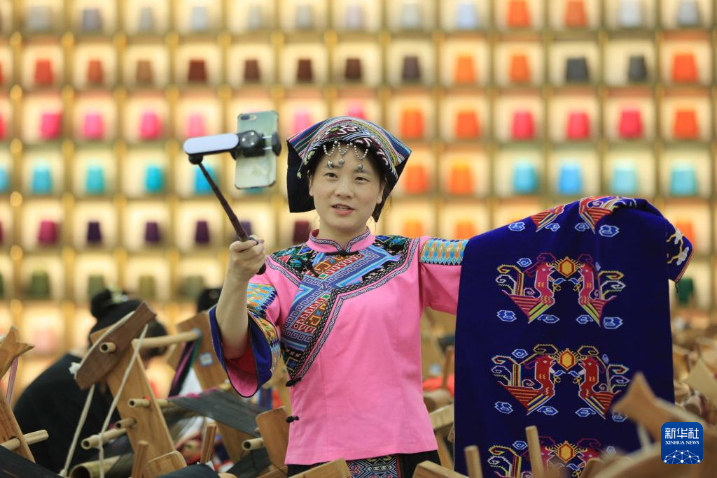 6月11日,在湖南省张家界市武陵源区乖幺妹土家族织锦基地,工人直播销售土家族织锦产品。