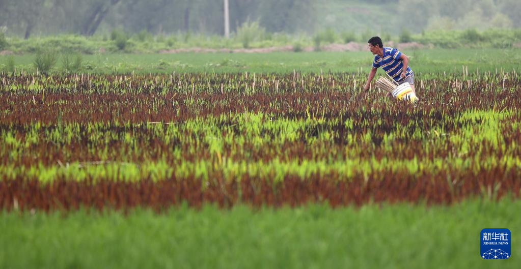 6月21日,工人在台安县辽河文化旅游景区稻田画田地里工作。