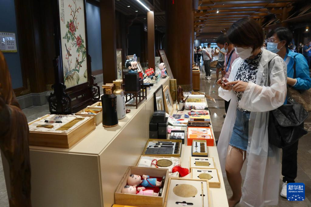 6月27日,参观者在“山东手造 济宁好礼”文创旅游商品展上观看各类文创旅游商品。