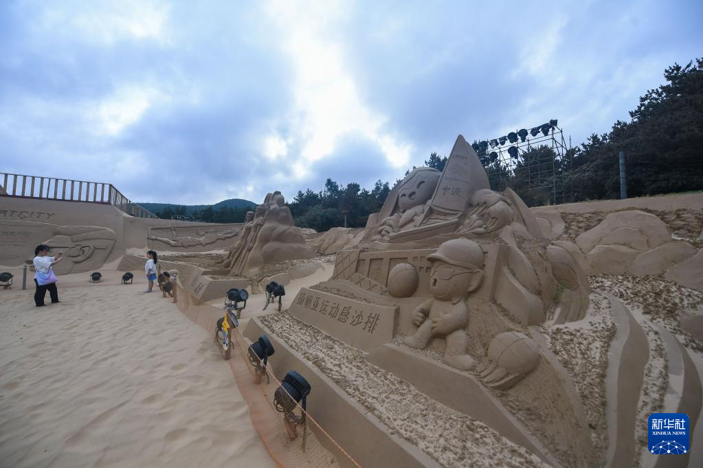 6月28日拍摄的展示运动项目主题的沙雕。