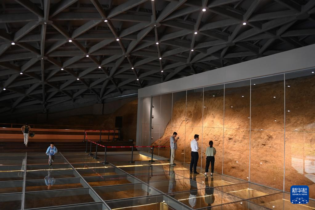 7月6日,观众在老虎岭水坝遗址展示馆内参观沙袋覆土回填保护区。