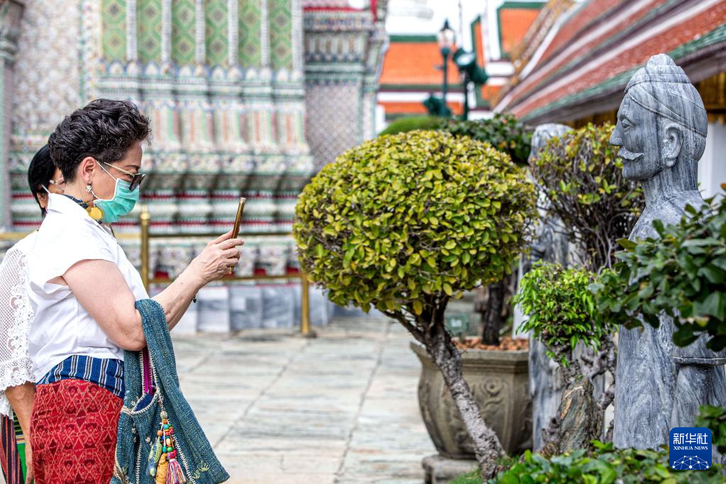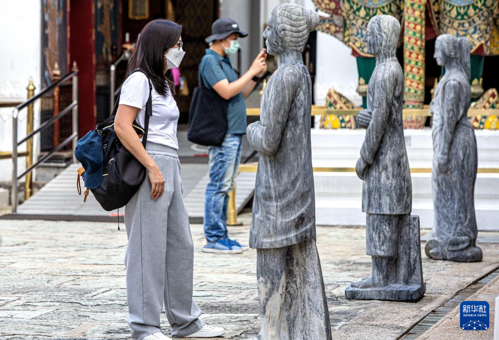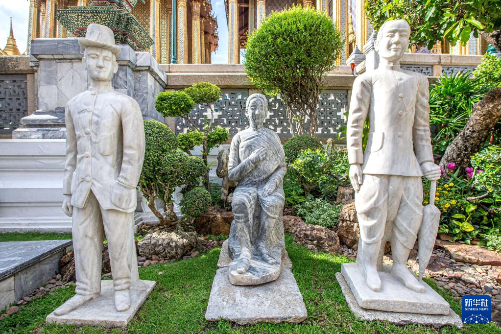 7月20日,在泰国曼谷大王宫玉佛寺,游客观赏来自中国的大理石雕像。