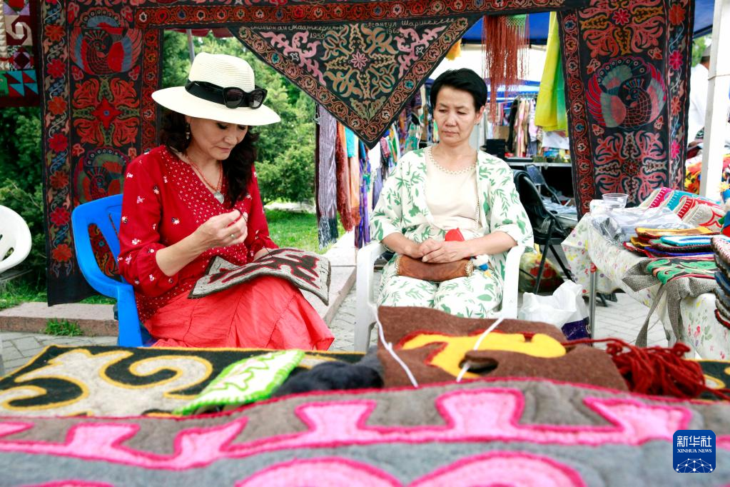 7月28日,手工艺人在吉尔吉斯斯坦首都比什凯克举办的国际传统文化和手工艺节上制作手工艺品。
