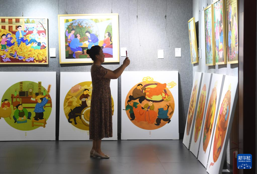 8月18日,在河南省漯河市舞阳农民画院,观众在农民画展览上拍照。