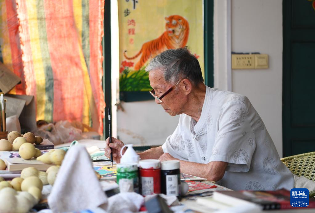 8月17日,在河南省漯河市舞阳县九街镇胡岗村,农民画画家胡振亚在创作。