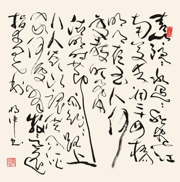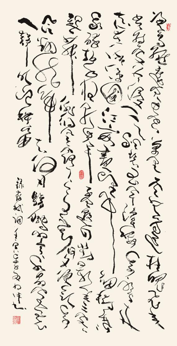 在诸多书体之中,马将伟尤其擅长草书,其作品如笔走龙蛇,苍劲多姿,一笔一划都似乎有了生命一般。这种一泻千里的笔墨气势充分体现出中国书法的意趣和灵动之美。在书法创作中,马将伟把用笔与用墨有机地结合起来,其字利落爽劲,毫无浮怯之态,真正达到了神韵天成的艺术效果。马将伟对墨的浓淡干湿把握得非常精准,其笔墨干而不燥,湿而不浮,轻松但不轻飘,灵动而暗沉内力,笔轻意重,有光彩,有活力。往往一幅作品写下来,呈现出一种江涛气势,龙马精神。