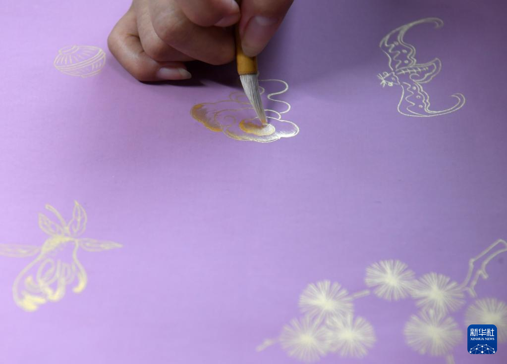 9月8日,纸笺加工技艺传习基地的工人在粉蜡笺上进行描金。新华社记者 刘军喜 摄