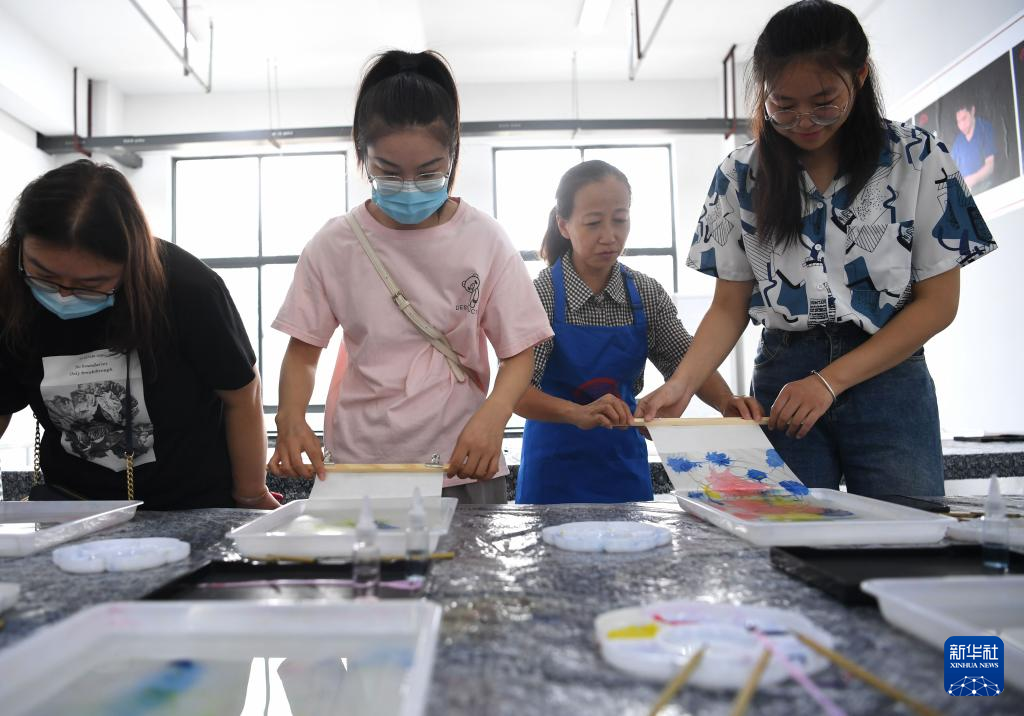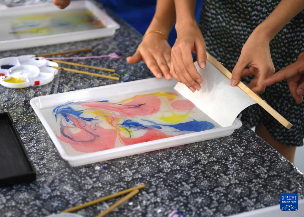 9月8日,在纸笺加工技艺传习基地,爱好者在体验流沙笺的制作工艺。新华社记者 刘军喜 摄
