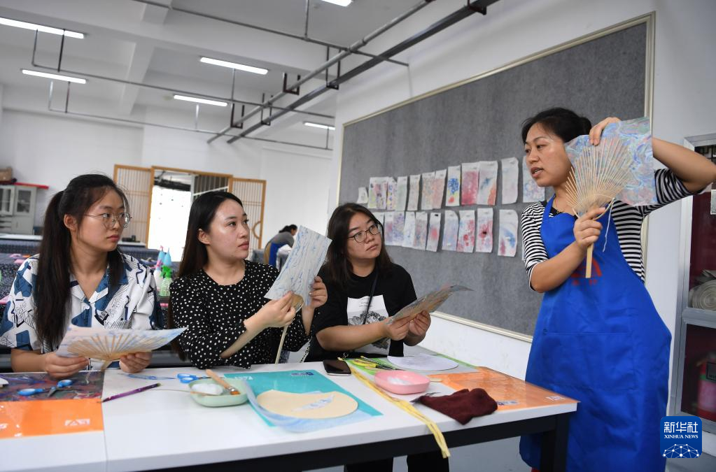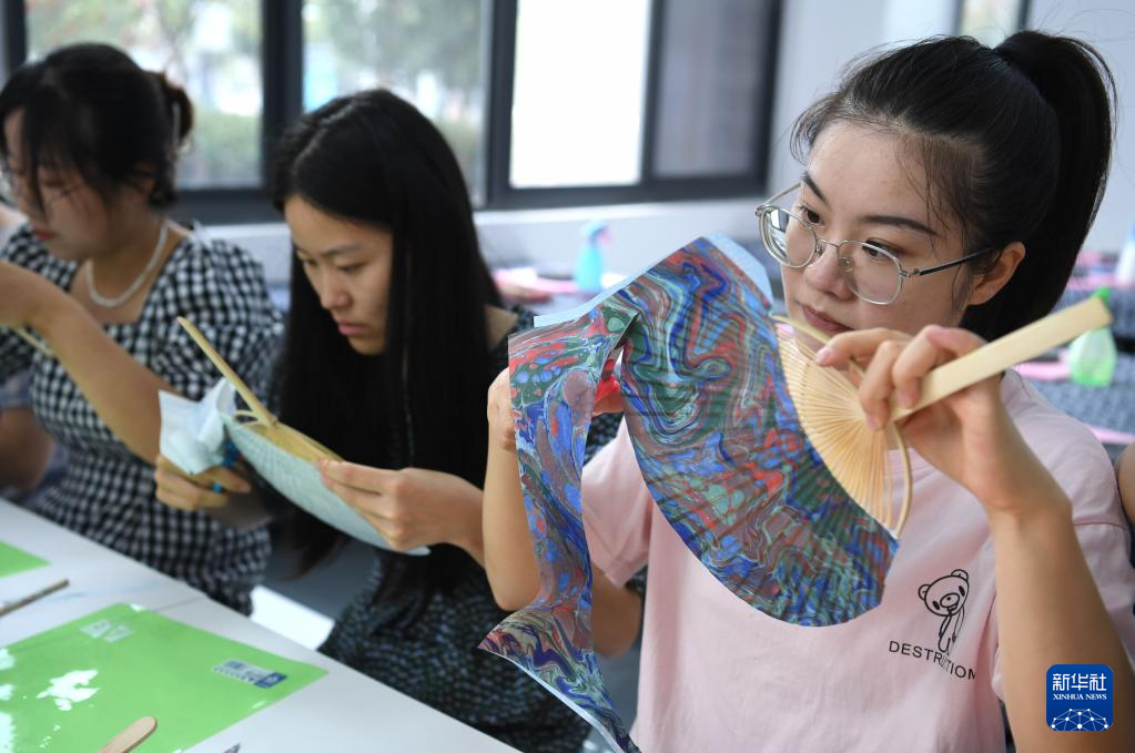 9月8日,在纸笺加工技艺传习基地,爱好者体验用流沙笺制作扇面。新华社记者 刘军喜 摄