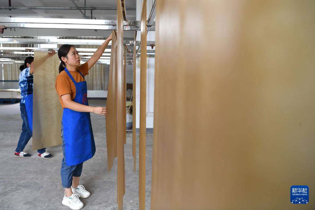 9月8日,在纸笺加工技艺传习基地,工人在进行纸笺加工的提挂工序。新华社记者 刘军喜 摄