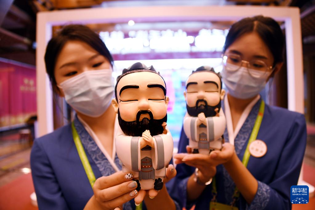 9月26日,两名会务志愿者在展示文创孔子像。新华社记者 李紫恒 摄