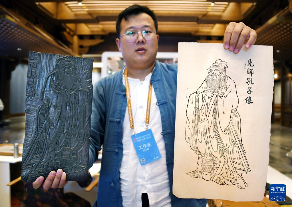 9月26日,木版年画非遗传承人潘成龙展示他创作的木版年画孔子像。新华社记者 李紫恒 摄