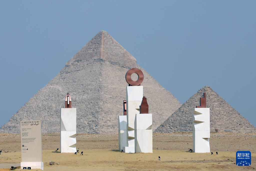 第二届“现在即永恒”埃及金字塔国际艺术展于27日在埃及吉萨金字塔景区内开幕,来自埃及、意大利、法国等国家的多位艺术家在景区内露天展出了12件大型雕塑等艺术作品。展览将持续到11月30日。