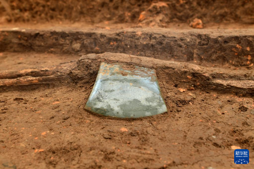 这是12月10日在河南南阳黄山遗址拍摄的屈家岭文化高级别大型墓葬中随葬的玉钺。