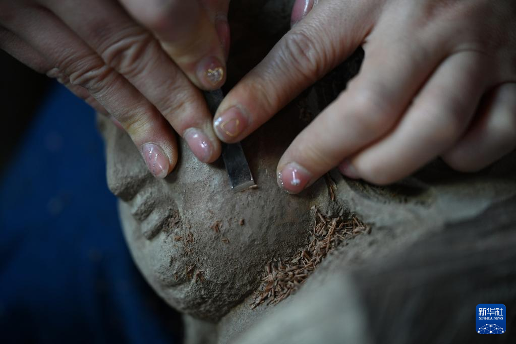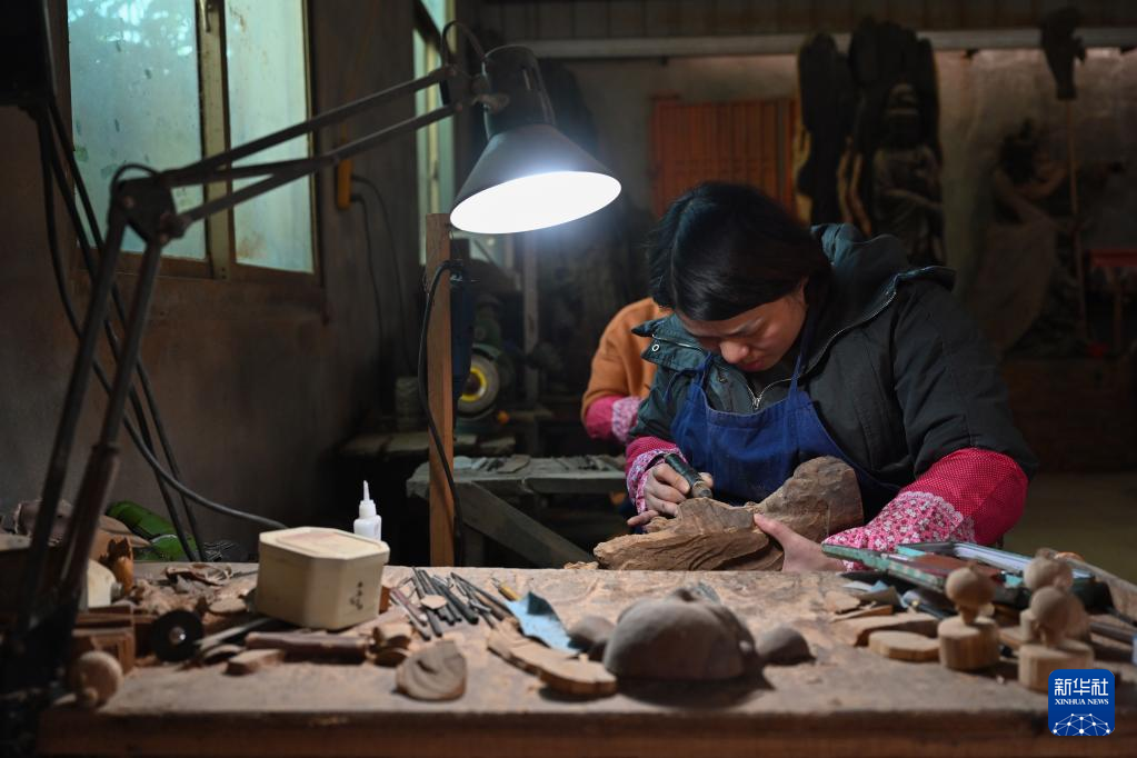 12月9日,陈志华的学徒在莆田市秀屿区根艺博物馆内制作根雕。