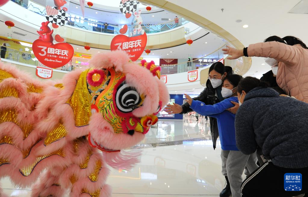 1月2日,家长带着孩子在山东省滕州市一家商场观看舞狮表演。新华社发(李志军 摄)