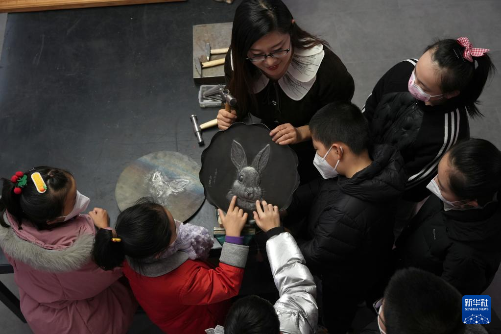 1月12日,在石家庄市新华区一个文化工作室,一名铁板浮雕艺人向小朋友展示生肖兔作品。新华社记者 骆学峰 摄