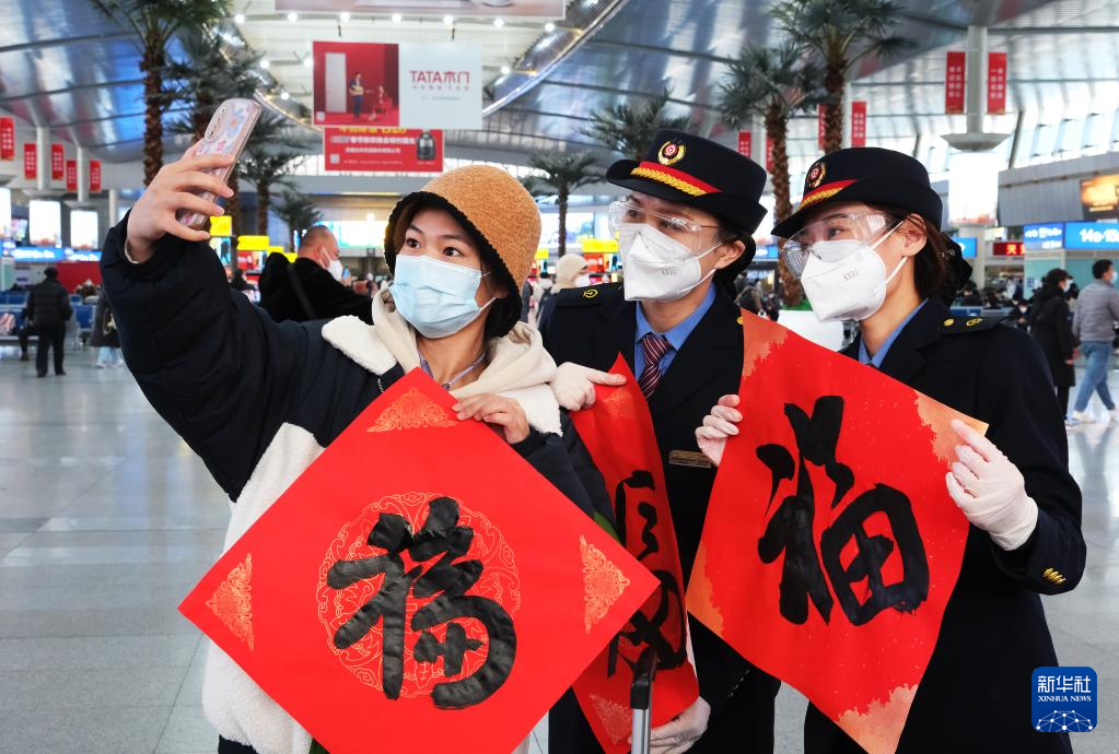 1月14日,天津站工作人员在候车大厅为旅客送上福字。新华社发(杨宝森 摄)