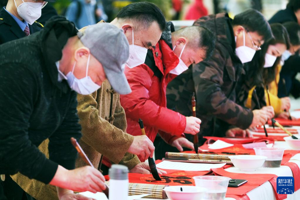 1月14日正值北方小年,一场“送万福、进万家”书法公益活动在天津站候车大厅举行。多名书法家现场书写福字和春联,由车站工作人员送给旅客,送上浓浓的祝福。