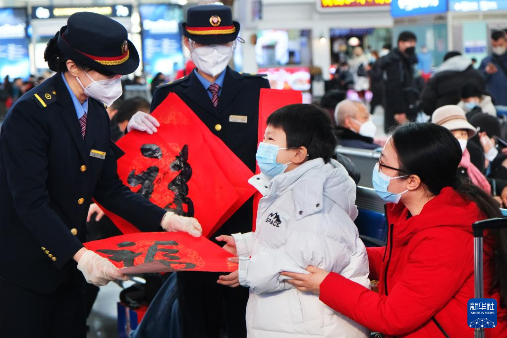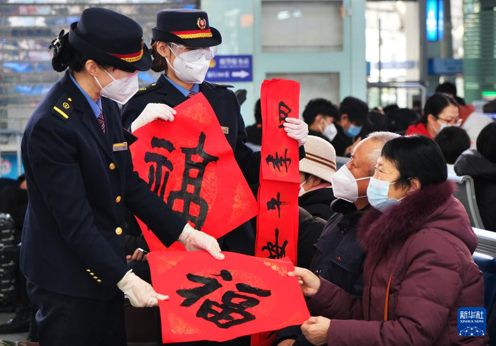 1月14日,天津站工作人员在候车大厅为旅客送上春联、福字。新华社发(杨宝森 摄)