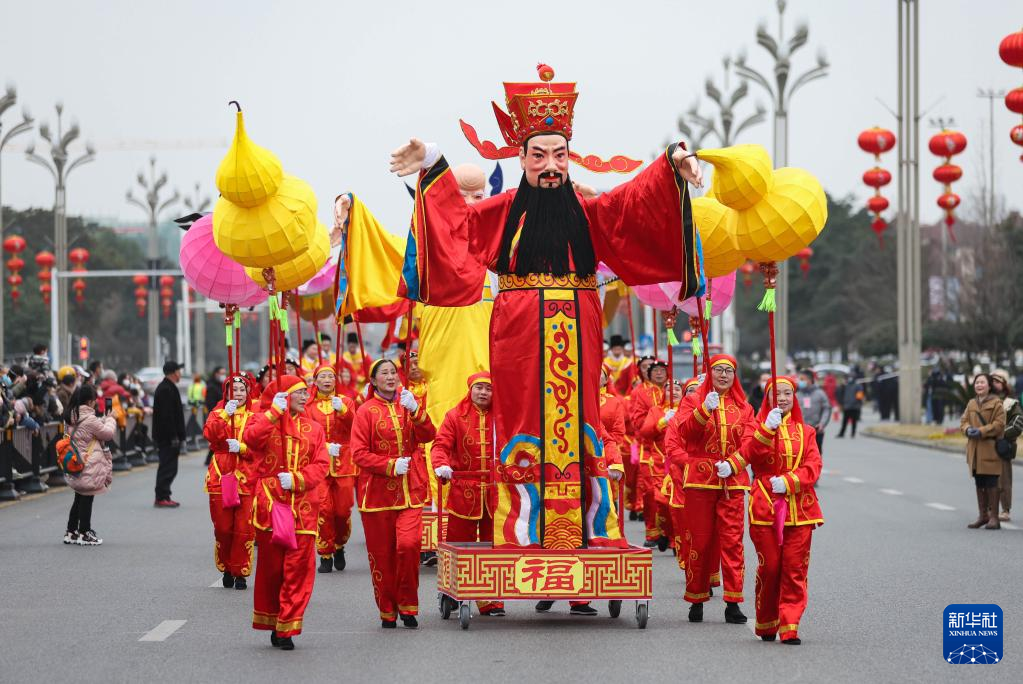 1月14日,在绵竹年画节开幕式上,游春队伍中的“五福献瑞”巡游队伍穿过绵竹市主干道。新华社记者 江宏景 摄