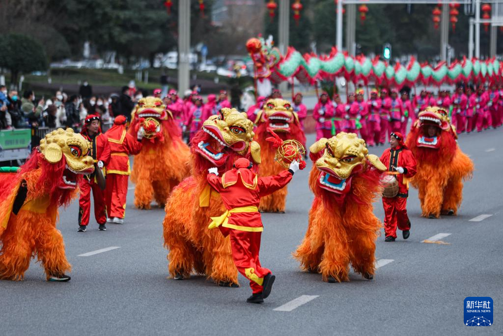 1月14日,在绵竹年画节开幕式上,狮灯队伍在街头巡演。新华社记者 江宏景 摄