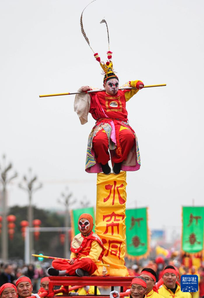 1月14日,在绵竹年画节开幕式上,游春队伍中社火平台“水帘洞”在街头巡演。新华社记者 江宏景 摄
