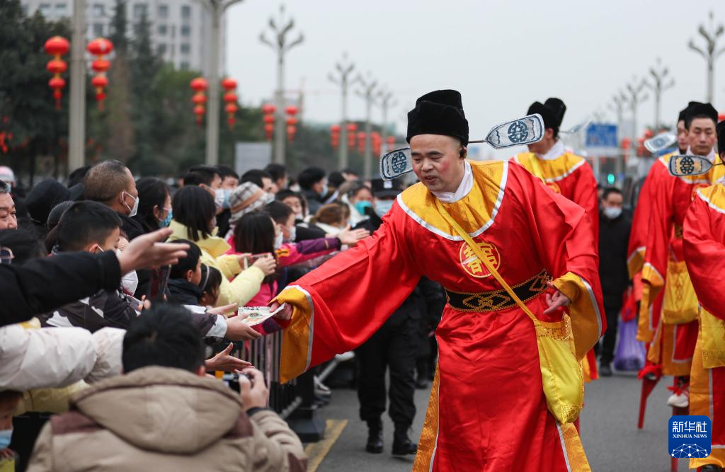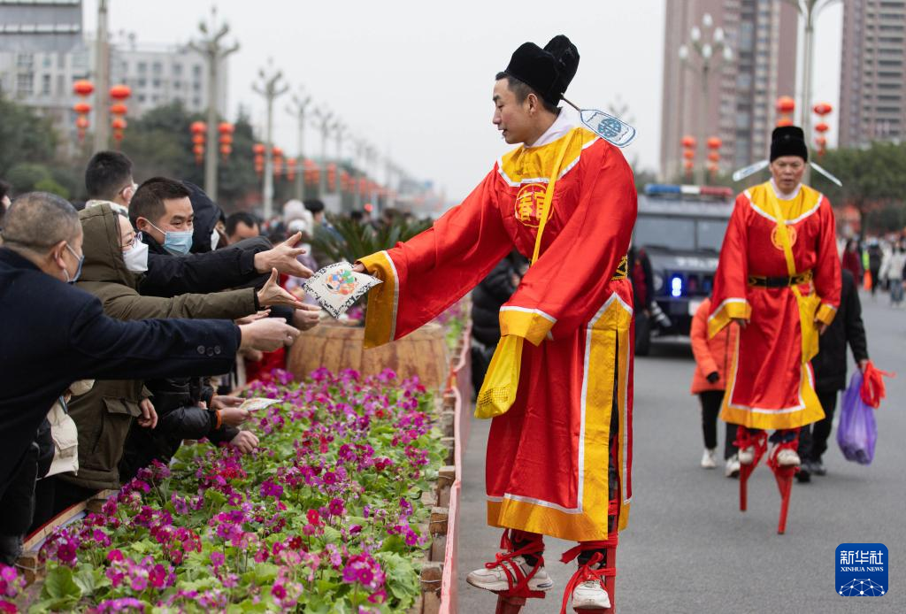 1月14日,在绵竹年画节开幕式上,“春官”踩着高跷向群众送福字和年画。新华社记者 江宏景 摄
