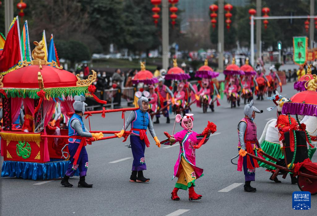 1月14日,在绵竹年画节开幕式上,以经典的绵竹年画《老鼠嫁女》为基础内容编排的表演队伍在街头巡演。新华社记者 江宏景 摄