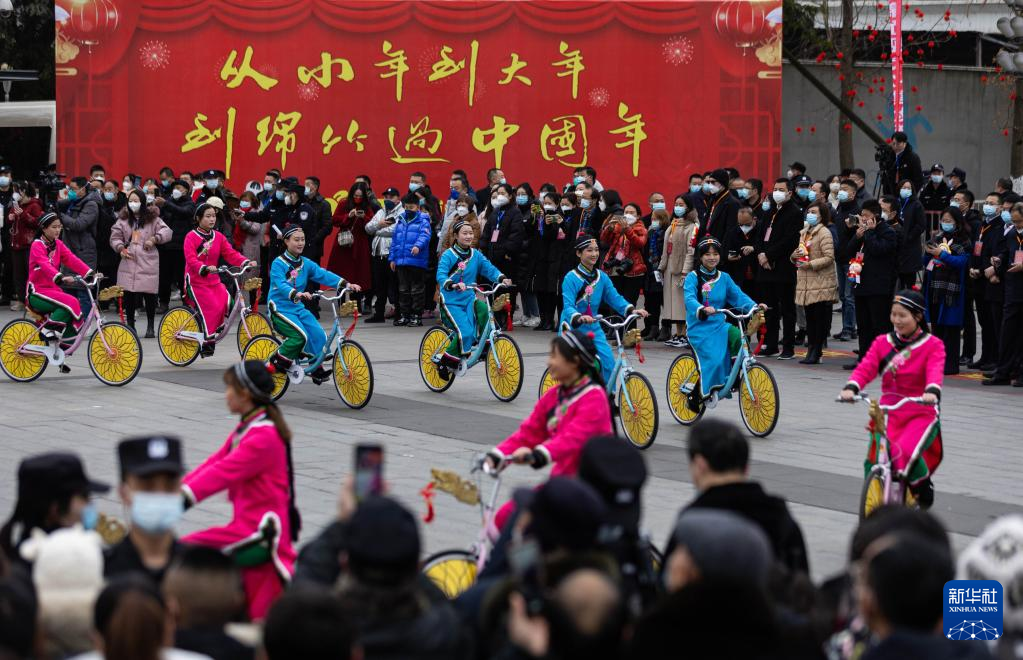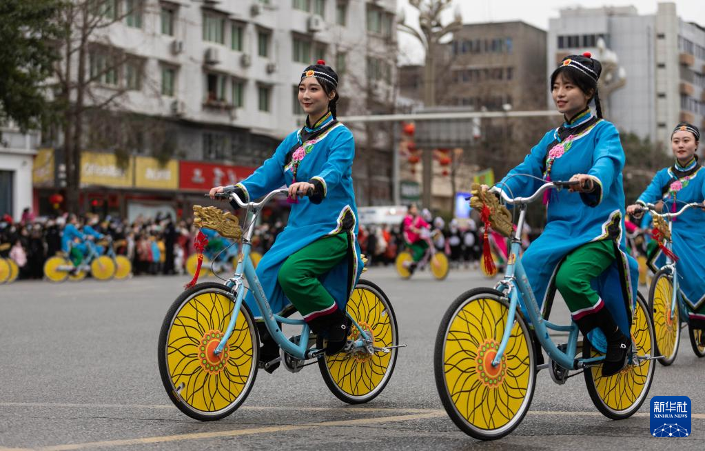 1月14日,在绵竹年画节开幕式上,以经典的绵竹年画《仕女图》为基础内容编排的“骑车仕女”在表演。新华社记者 江宏景 摄