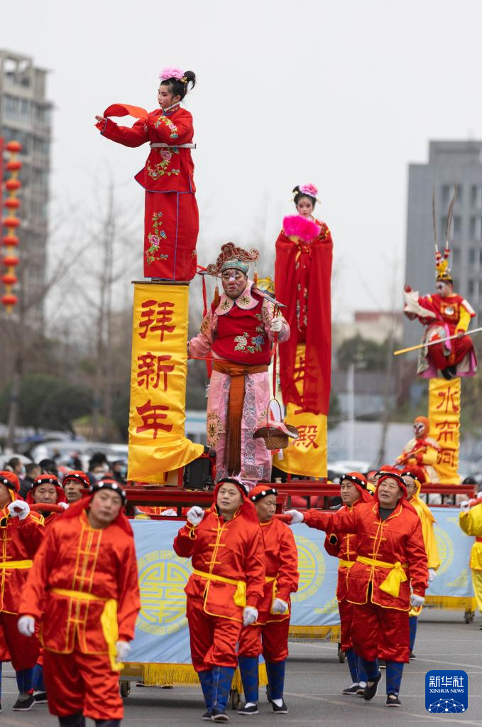 1月14日,在绵竹年画节开幕式上,游春队伍中社火平台“拜新年”“长生殿”“水帘洞”等在街头巡演。新华社记者 江宏景 摄