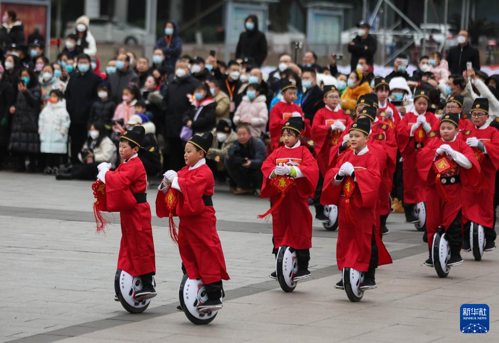 1月14日,在绵竹年画节开幕式上,游春队伍中的“福娃”踩着平衡车在街头送福。新华社记者 江宏景 摄