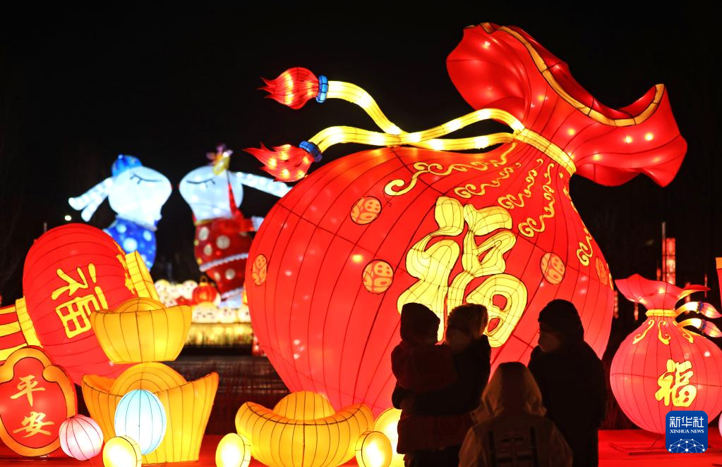 1月15日,游客在沈阳故宫门前欣赏花灯。