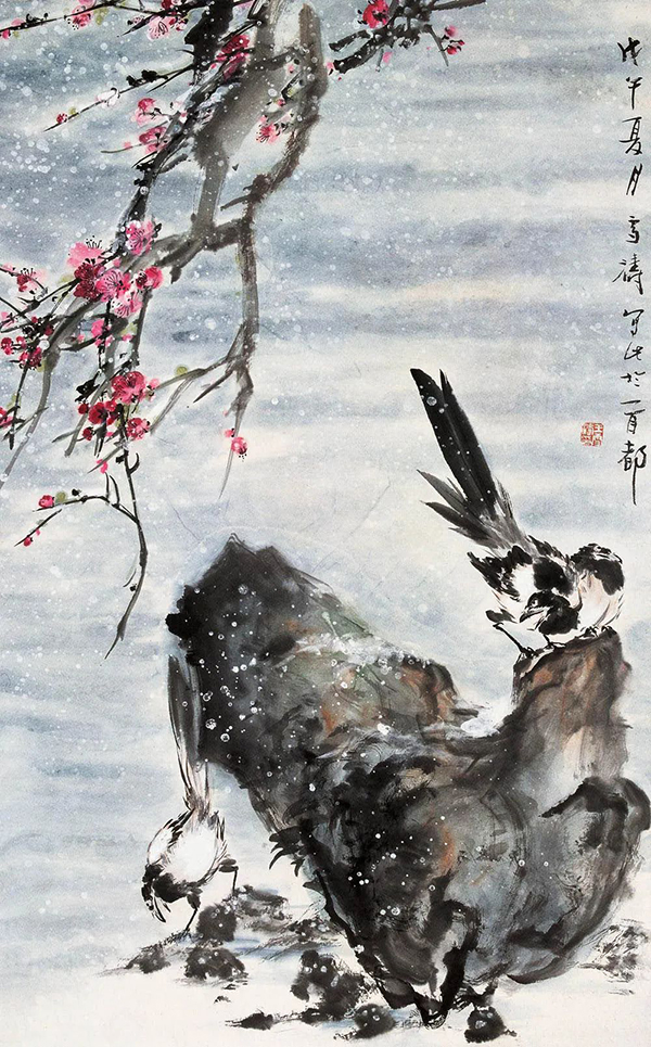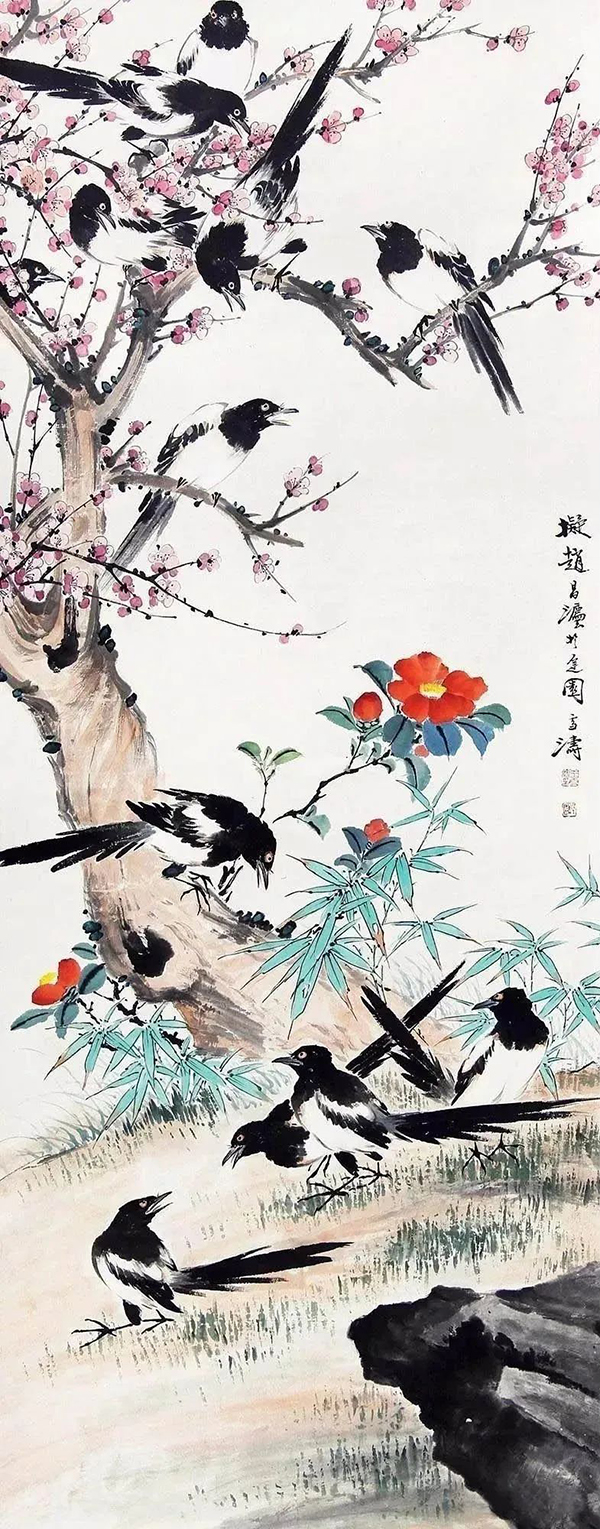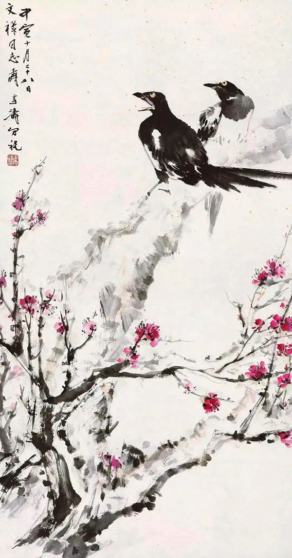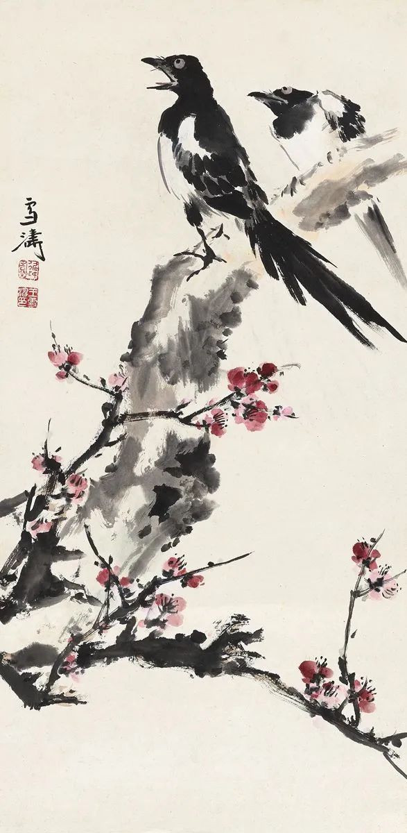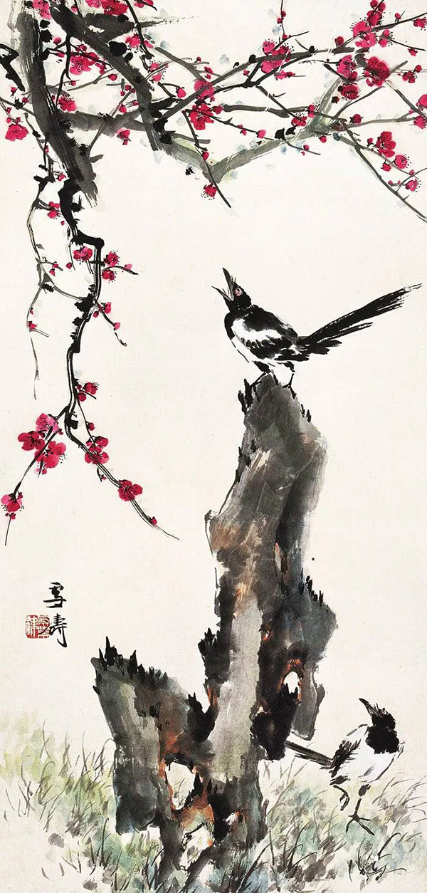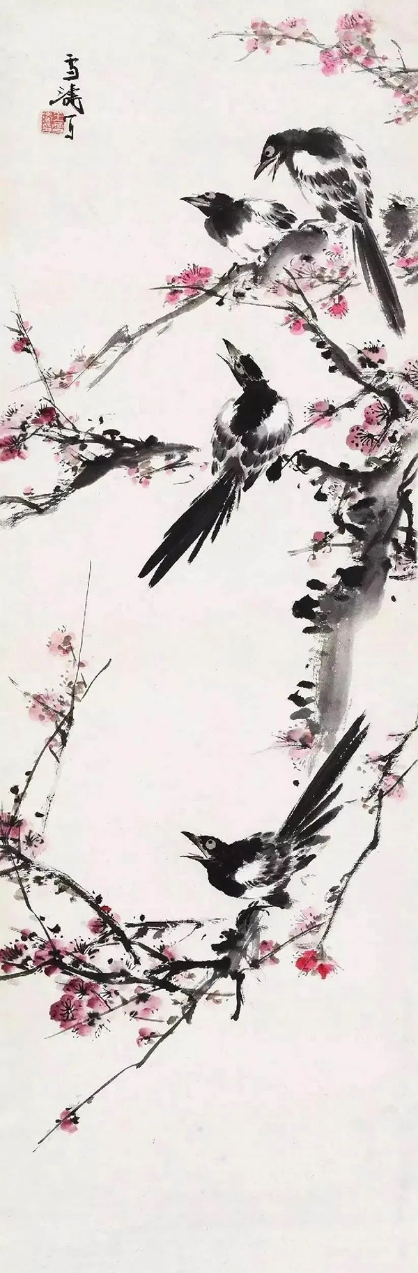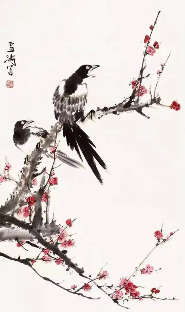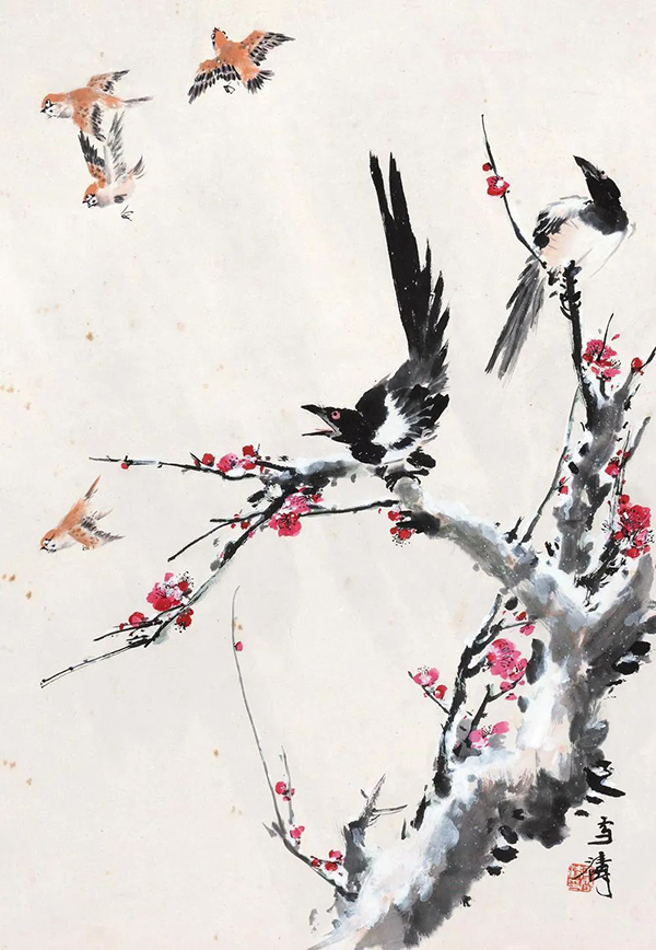 王雪涛以高度概括、爽利果决的笔墨写梅枝,劲挺老辣;点点红梅,绚烂至极;喜鹊笔笔生发,灵动活泼,跃然而出,既符合了时代特色又令纸面文气不减前人,真是令人连连称绝。