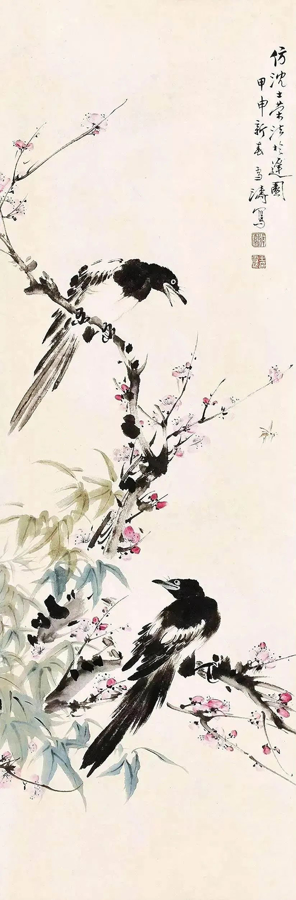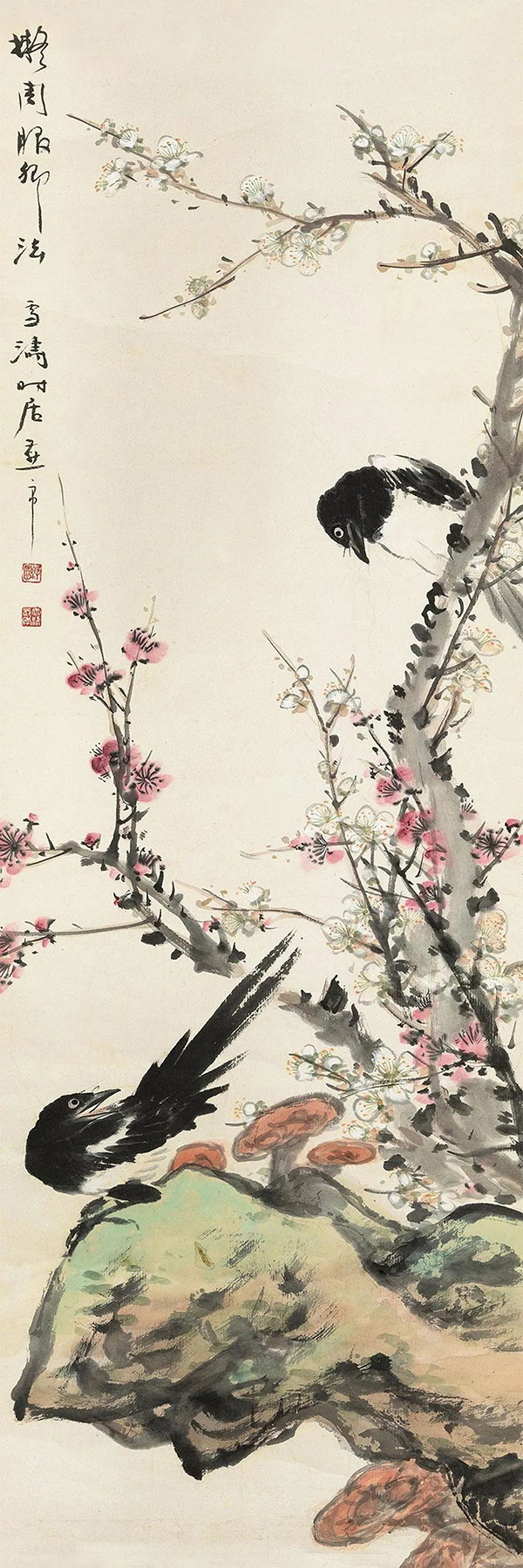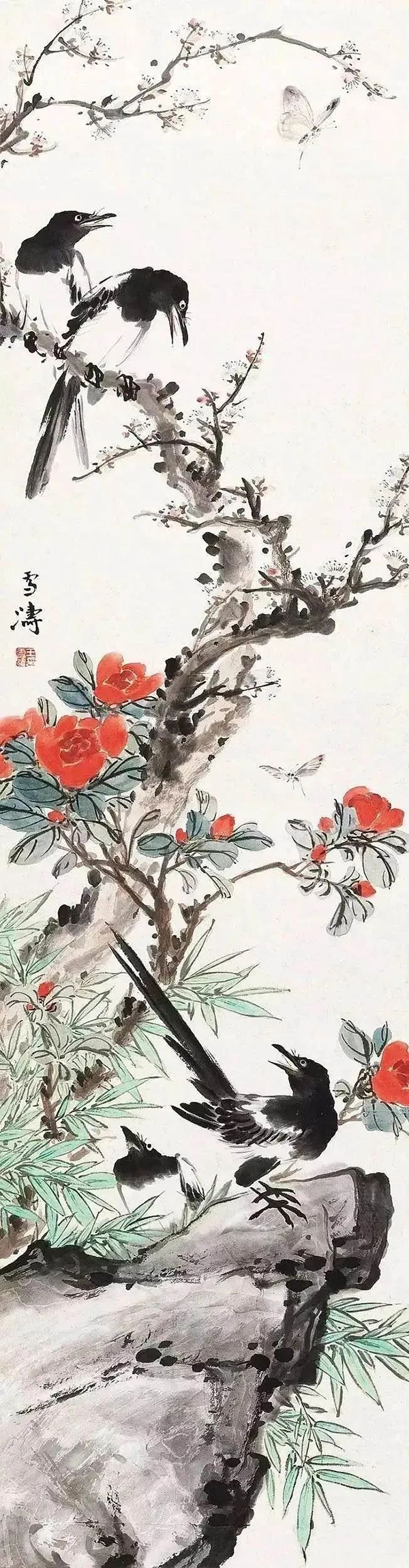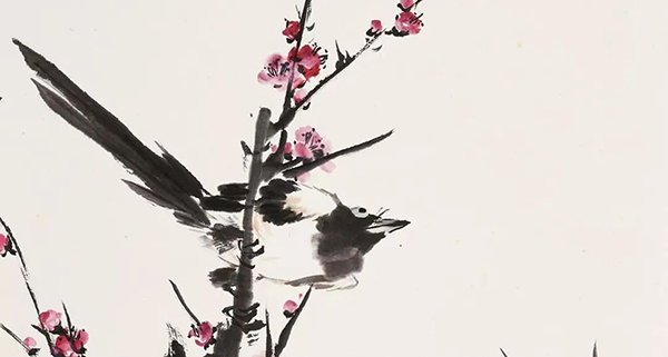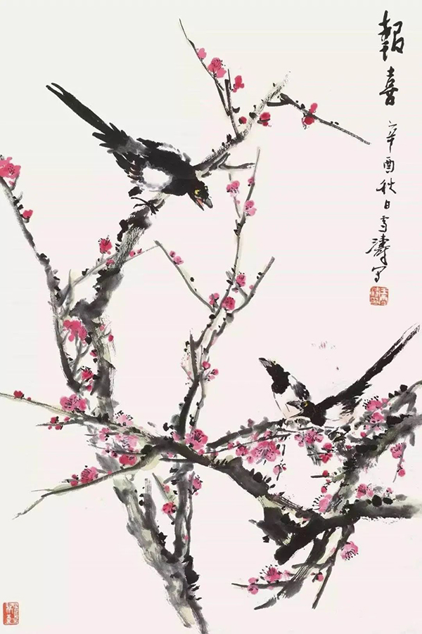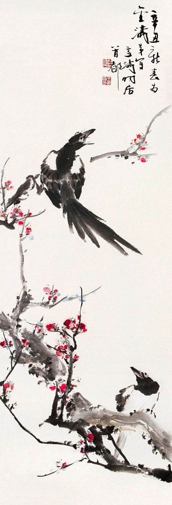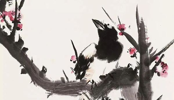 王雪涛以高度概括、爽利果决的笔墨写梅枝,劲挺老辣;点点红梅,绚烂至极;喜鹊笔笔生发,灵动活泼,跃然而出,既符合了时代特色又令纸面文气不减前人,真是令人连连称绝。
