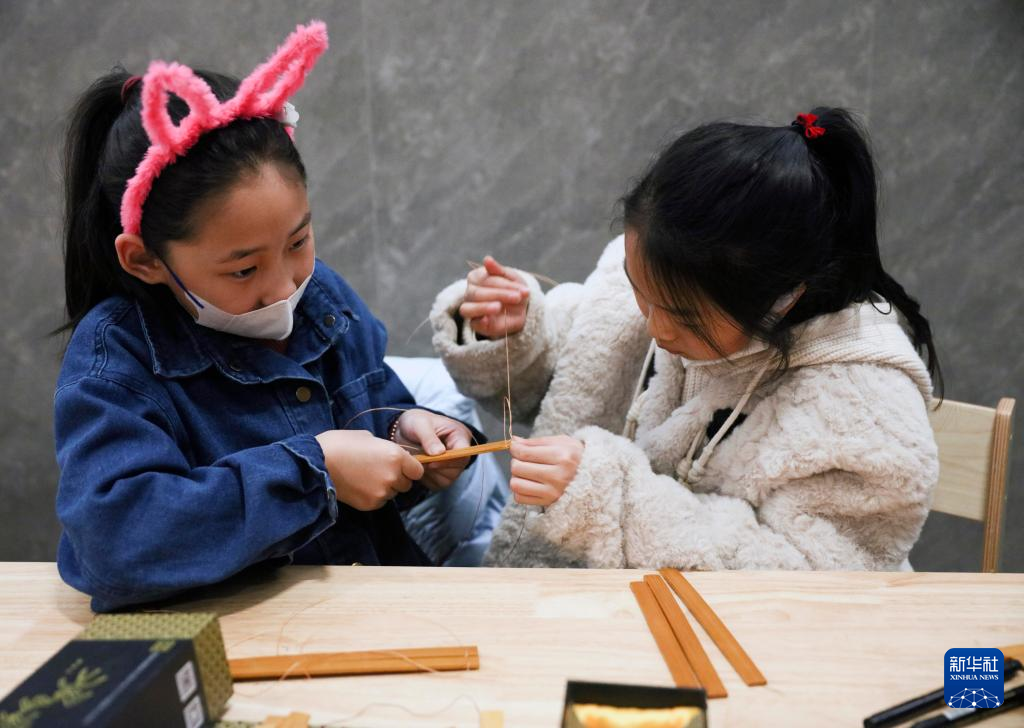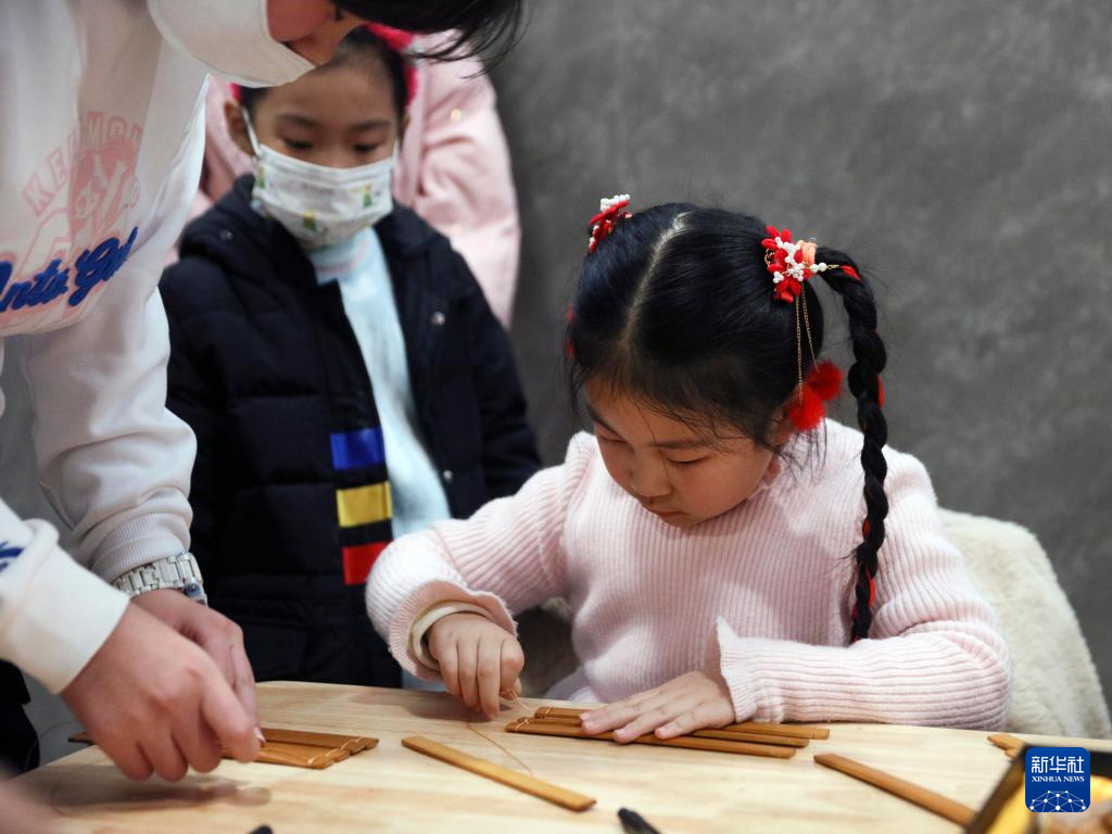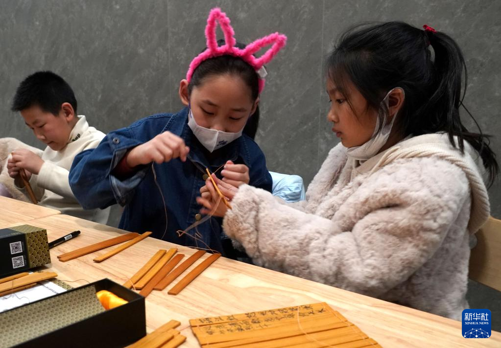 2月4日,小朋友在中国文字博物馆体验竹简制作。
