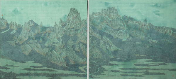 贺海锋的山水画以工笔赋彩为主,兼具北方山水的硬朗坚毅和南方山水的明快清秀,整体格调挺拔硬朗。贺海锋熟练地运用传统山水画技法,以传统皴法密集铺排长短线条,再现山川河流的面貌和走向,同时极力以这种严谨、繁复的方式结构出简约的图式,画面效果格外具有整体性。