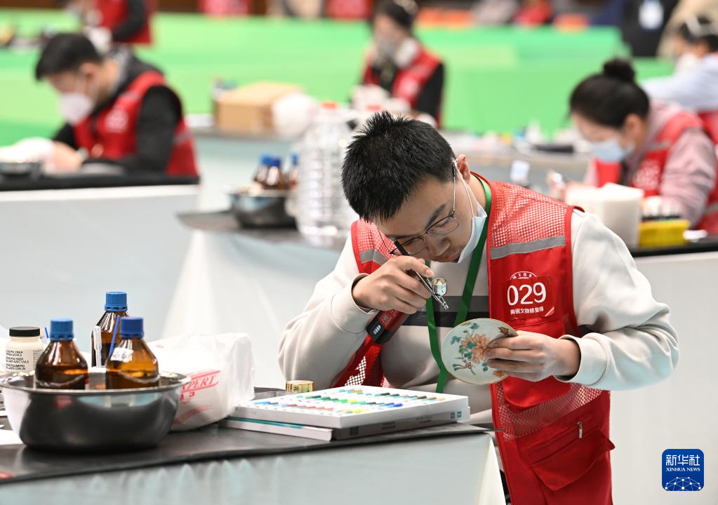 一位参加陶瓷文物修复师比赛项目的选手在现场进行文物修复(3月25日摄)。