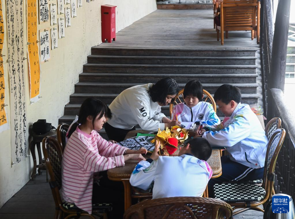 4月12日,诸暨市东白湖镇斯民小学的学生在上宫灯制作课程。